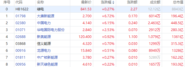 绿电概念股午后跑出,大唐新能源(01798)、中国电力(02380)涨近7%,华电国际电力股份(01071)涨2.53%,信义能源(03868)涨2.1%,华润电力(00836)涨1.22%。