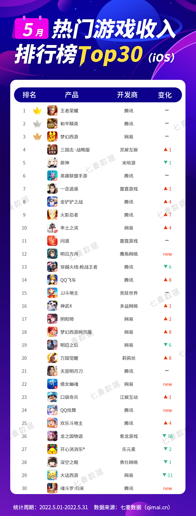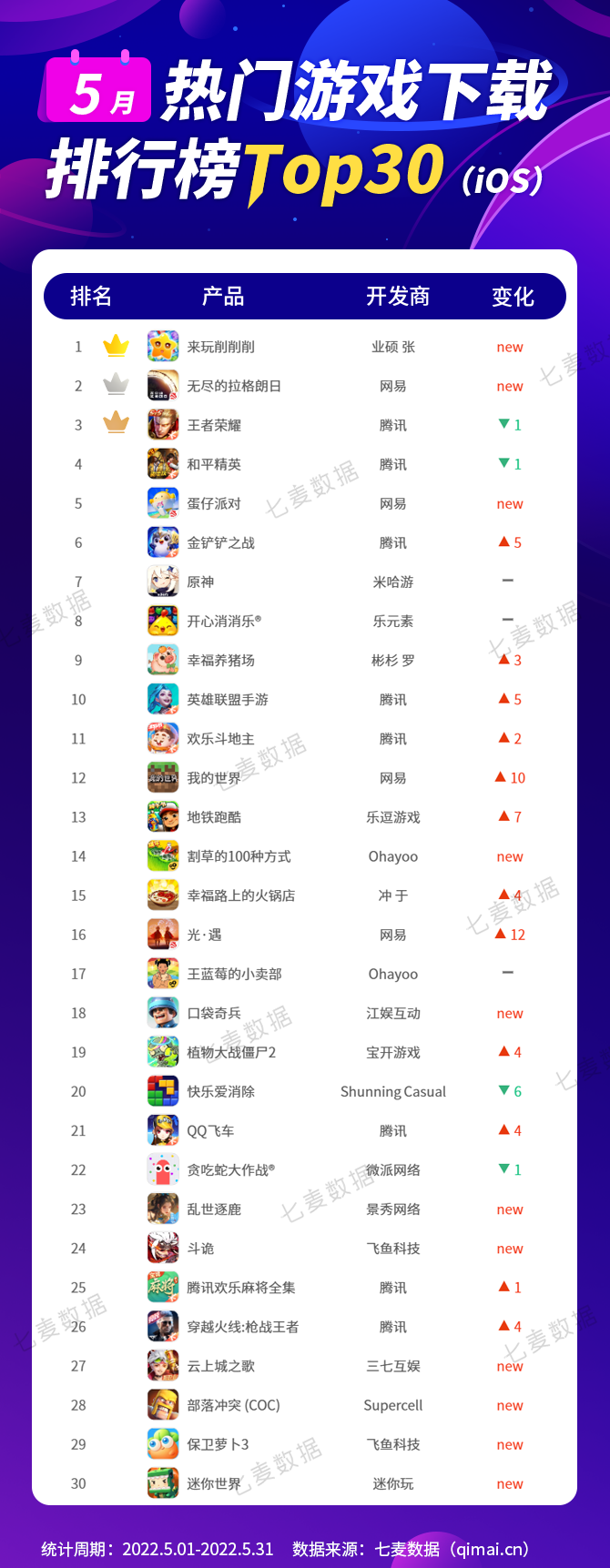近日,七麦数据发布了 2022 年 5 月热门游戏排行榜,包含游戏下载榜和游戏收入榜。 热门游戏下载榜 Top 30 中,来自个人开发者的网赚游戏「来玩削削削」占据榜首,网易旗下宇宙策略游戏「无尽的拉格朗日」占据榜单 Top2,腾讯老牌手游「王者荣耀」占据 Top3。