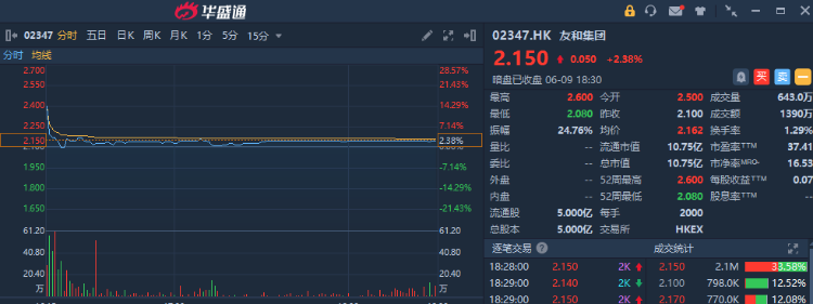 华盛资讯6月9日讯,香港电商平台友和集团 $02347.HK 暗盘高开19.05%,尾盘走低收涨2.38%,一手账面浮盈100港元,最新总市值超10亿港元。该股预计将于明日(6.10)正式港股挂牌上市。