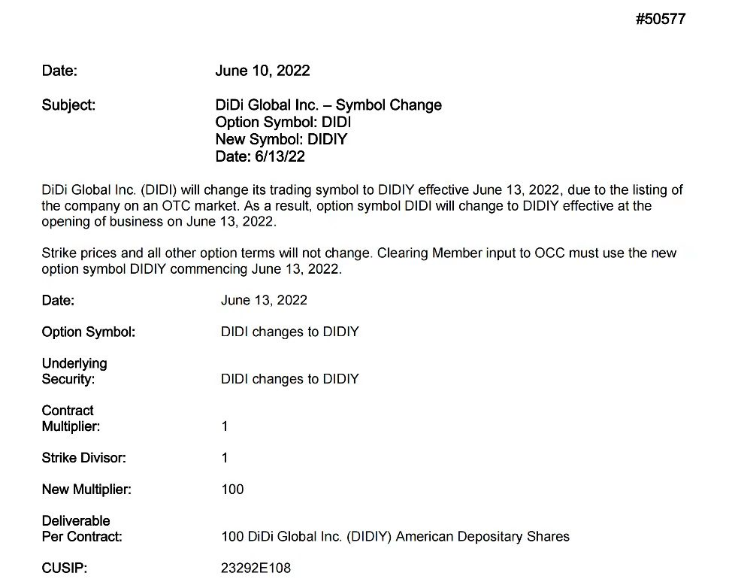 据OCC今日文件,滴滴将于周一6月13日退市,并转到OTC粉单市场交易,交易代码“DIDIY”。