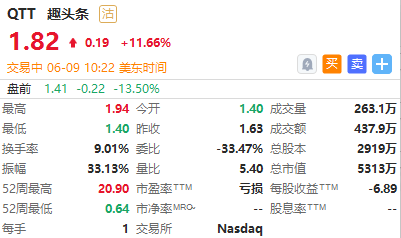 趣头条逆市涨超11%,该股连续六个交易日上涨,昨日曾收涨逾70%。