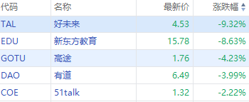中概在线教育股集体下跌,好未来跌超9%,高途跌超4%,有道跌近4%,51talk跌超2%。