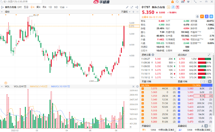 华盛资讯6月10日消息,港股教育股走高,新东方在线大涨近20%,现报5.35港元每股,成交额1.1亿港元;消息面上,俞敏洪日前称已组建“新东方直播间”队伍专门推广教育产品。
