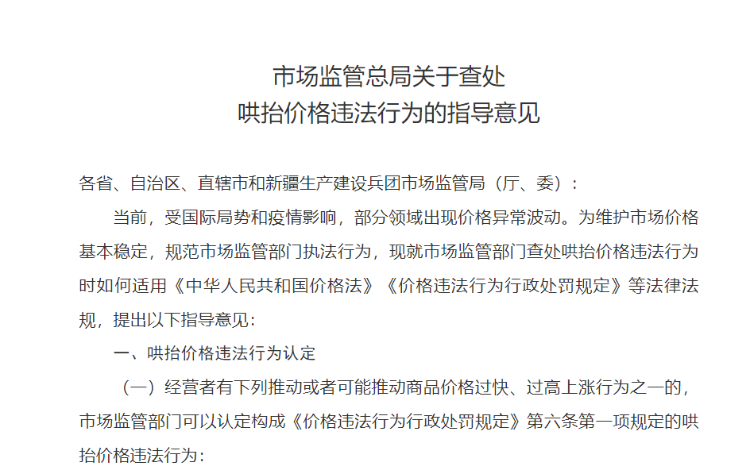 6月10日消息, 国家市场监管总局发布关于查处哄抬价格违法行为的指导意见。指导意见提出,各级市场监管部门要加大市场巡查力度,及时梳理投诉举报线索,密切关注群众反映问题,加强对重点区域、重点环节、重点商品的价格监管,依法查处哄抬价格等价格违法行为。对性质严重、社会影响大的典型案例要公开曝光,发挥震慑和警示作用。