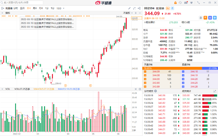 华盛资讯6月10日消息,港股比亚迪股份午后持续走高,涨超5%,报314.8港元每股,成交额16.13亿港元。值得注意的是,比亚迪A股大涨6.72%,盘中创历史新高,总市值突破万亿关口,现成交额达90亿。