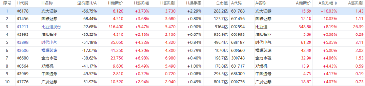 截至发稿,光大证券A股三连涨停,H股涨3.37%;国联证券A股涨停,H股涨3.68%。比亚迪A股涨8.19%,H股涨5.47%。