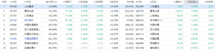 山东墨龙A股跌2.95%,H股跌1.19%;康龙化成A股跌1.90%,H股跌2.52%;山东黄金A股跌1.34%,H股跌0.87%。