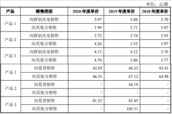 其二,天德钰向关联方销售单价曾出现过较大折扣或有较高溢价,如在2018年,天德钰向夏普销售的“产品1”,单价为93.41元/颗,而向其他客户销售的单价则只有64.98元/颗,即同款产品向夏普的销售单价溢价大约44%;而到了2019年,天德钰向夏普销售的“产品1”价格却又出现了大笔折扣,相对其他客户单价相当于打了66折(表6)。