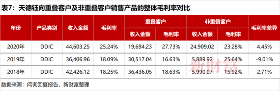 天德钰与重叠客户之间的交易,不仅定价的浮动幅度较大,毛利率表现也有相当的不确定性,仅DDIC产品,重叠客户在2018年为天德钰贡献3.6亿元营收,占其当年5亿元总营收的7成,毛利率比非重叠客户高出了2.7个百分点。