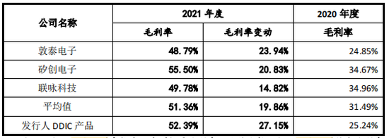 天德钰的主打产品无疑是DDIC,2019年至2021年累积创收16.45亿元,占其总营收21.41亿元的比例为76.8%。和同行业公司相比,天德钰这块主营业务的盈利能力也不输对手(表2)。