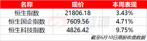 恒生指数本周涨3.43%,报21806.18点;恒生科技指数本周涨9.75%,报4826.42点;国企指数本周涨4.71%,报7609.56点。