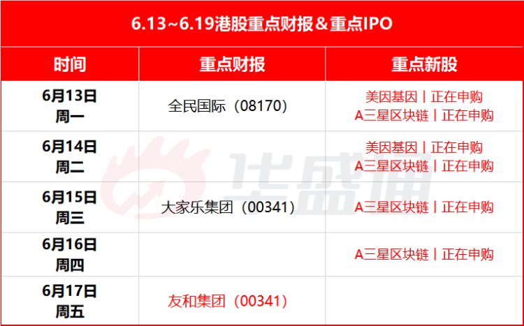 财报方面,港股友和集团下周五发布财报,公司本周刚刚挂牌上市;下周三关注香港餐饮龙头大家乐集团;新股方面,美因基因将于下周三结束认购,A三星区块链 ETF周四结束认购。