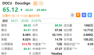 DocuSign $DOCU 绩后重挫,领跌美股SaaS概念股。该公司周四美股盘后公布的数据显示,Q1营收为5.887亿美元,同比增长25.49%,市场预期为5.819亿美元;净亏损同比扩大至2740万美元;每股收益为0.38美元,同比下降13.64%,低于市场预期的每股收益0.46美元。
