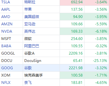 明星科技股集体走低,Adobe跌超7%,亚马逊跌超5%,奈飞跌超4%,谷歌、苹果、特斯拉跌超3%。
