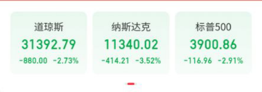 当地时间6月10日,美国股市大幅下跌。截至收盘,道琼斯工业平均指数下跌880点,跌幅达2.73%,收报31392.79点;标准普尔500指数下跌117点,跌幅达2.91%,收报3900.86点;纳斯达克综合指数下跌414点,跌幅达3.52%,收报11340.02点。