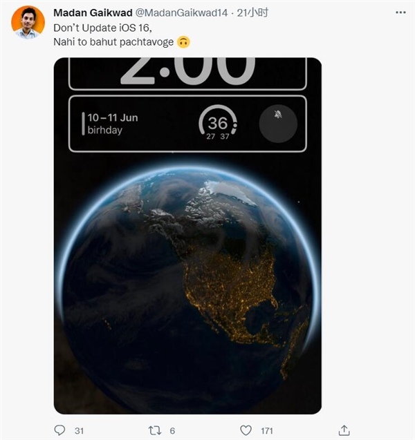 6月11日消息,海外博主Madan Gaikwad在社交平台上表示,不要升级iOS 16系统,升级了会后悔。