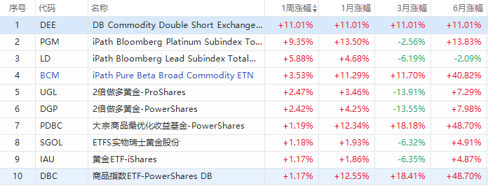 商品ETF方面,周五市场避险情绪极速升温带动金价反弹,COMEX 8月黄金期货全周累计上涨1.4%。做多黄金类ETF走高,彭博白金ETN $PGM 领涨,全周涨超9%;2倍做多黄金ETF $UGL $DGP 均涨超2%。