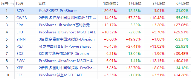 区域ETF方面,本周涨幅位居首位的是2倍做空巴西ETF $BZQ ,全周累涨20.62%。巴西股市本周重挫,巴西IBOVESPA股指连续5个交易日下跌,受疫情和通胀因素影响,其股市创下两年以来最糟糕的表现。
