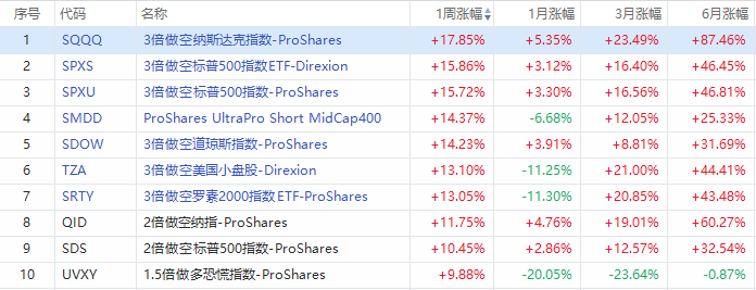 本周做空股指类ETF上涨较多。3倍做空纳斯达克指数ETF $SQQQ 周涨17.85%,领涨股指ETF。3倍做空标普500指数ETF $SPXS 周涨15.86%,3倍做空道指ETF $SDOW 周涨14.23%。同时,1.5倍做多恐慌指数ETF全周上涨近10%。