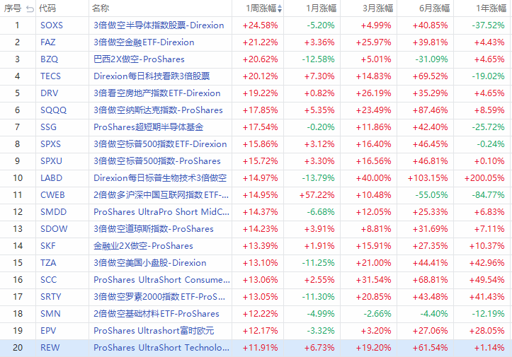 从ETF涨幅榜来看,做空类ETF为本周赢家。3倍做空半导体指数股票 $SOXS 全周累计上涨24.58%,坐稳涨幅榜冠军。3倍做空金融ETF $FAZ 周涨21.22%,3倍做空纳斯达克指数ETF $SQQQ 周涨17.85%。
