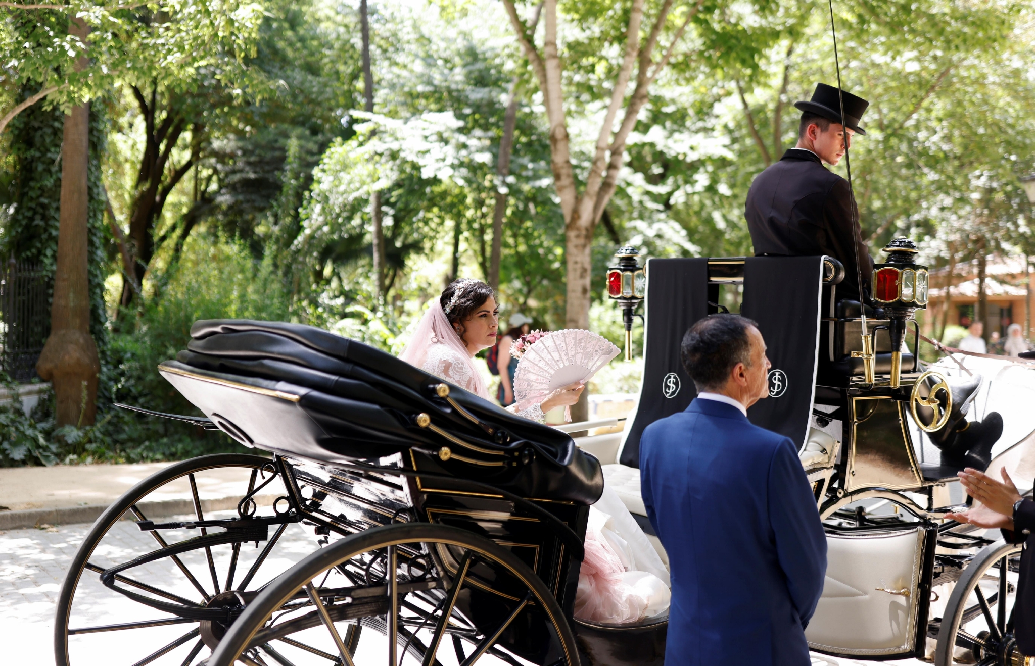 当地时间6月11日,西班牙塞维利亚。一名新娘在婚礼时扇扇子。