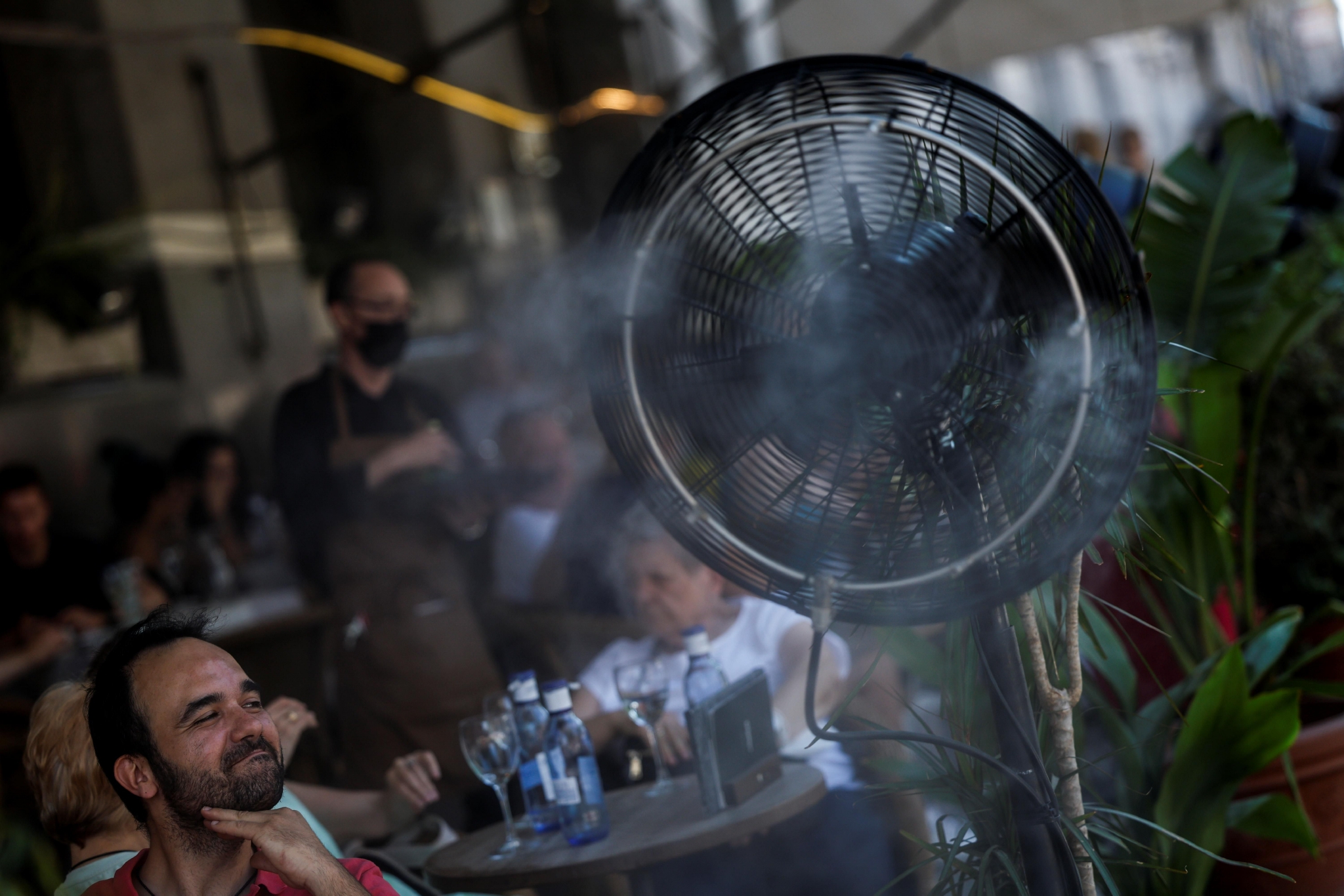 当地时间6月11日,西班牙马德里。顾客吹风扇消暑。