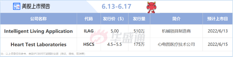 本周,市场预计将迎来2只新股,包括1只中概股——机械锁具制造商Intelligent Living Application $ILAG ,以及心电图医疗技术公司Heart Test Laboratories $HSCS 。