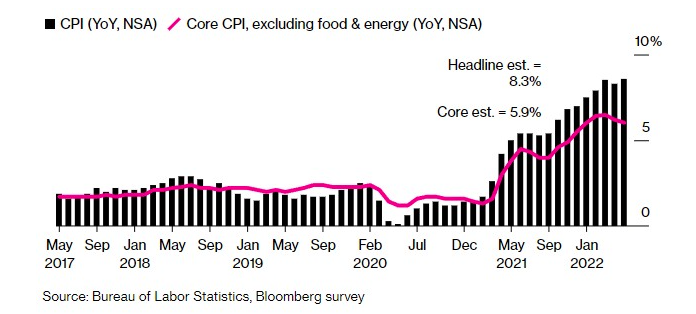 上周五,美国劳工统计局公布的数据显示,美国5月CPI同比上涨8.6%,较上个月的8.3%进一步加速,创1981年12月以来新高,高于市场预期的8.3%;5月CPI环比增长1%,高于市场预期的0.7%以及上个月的0.3%。此外,不包括食品和能源的核心CPI同比增长6.0%、环比增长0.6%,均高于预期。