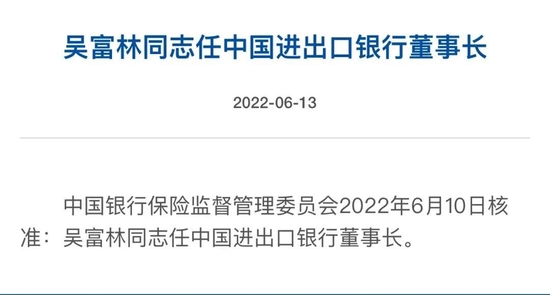 6月13日,中国进出口银行在官网上发布消息称,中国银行保险监督管理委员会2022年6月10日核准:吴富林同志任中国进出口银行董事长。
