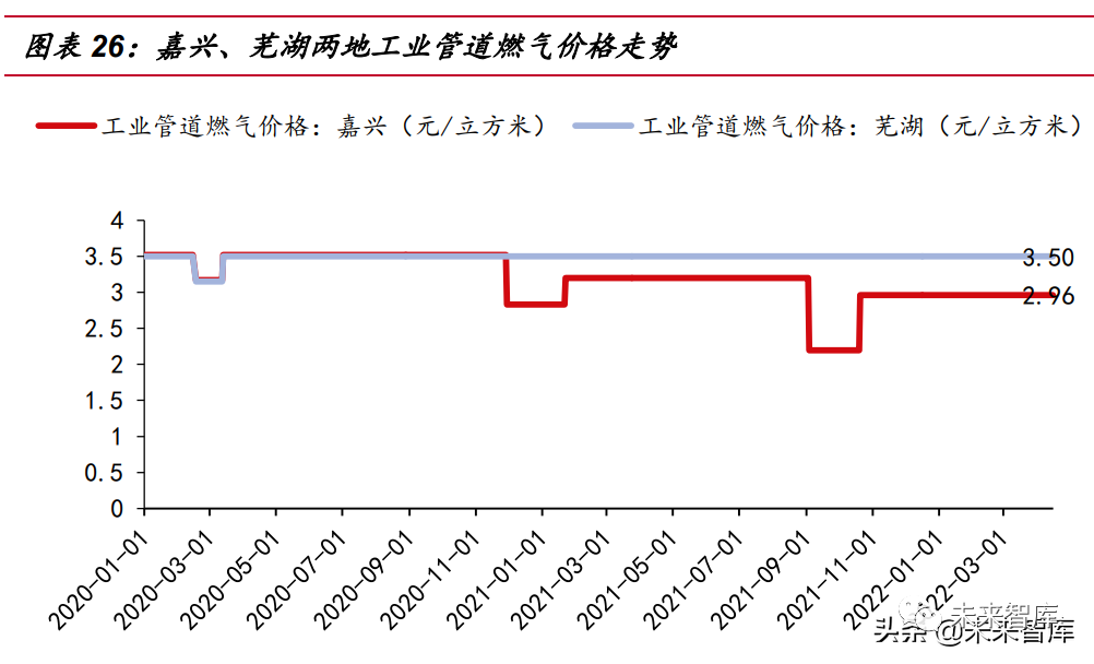 燃料:降低能耗是光伏玻璃企业成本竞争之核心。燃料作为光伏玻璃生产中成 本中第一大构成,企业工艺先进程度、单位能耗和余热利用率直接影响其生产成本, 是光伏玻璃企业竞争中的关键。当前受环保政策、气油价比高等影响,光伏玻璃企业 从原本的油气共用逐步转向以燃气为主,燃油为辅的模式,甚至于新项目全采用天然 气,燃油仅作为备用燃料。管道燃气价格相对稳定,存在区位成本优势。受俄乌冲突影响,全球能源价格走 高,光伏玻璃企业供气主要依靠当地管道供应工业用燃气或液化 LNG。我国各地工 业管道燃气价格相对稳定,受国际能源价格影响较小,但散装液化 LNG 价格更为市 场化。拥有固定供气的企业在成本预算上也更加有预见性,嘉兴管道燃气价格相较芜 湖低 15.43%,体现在总生产成本上约为 5%的降幅。