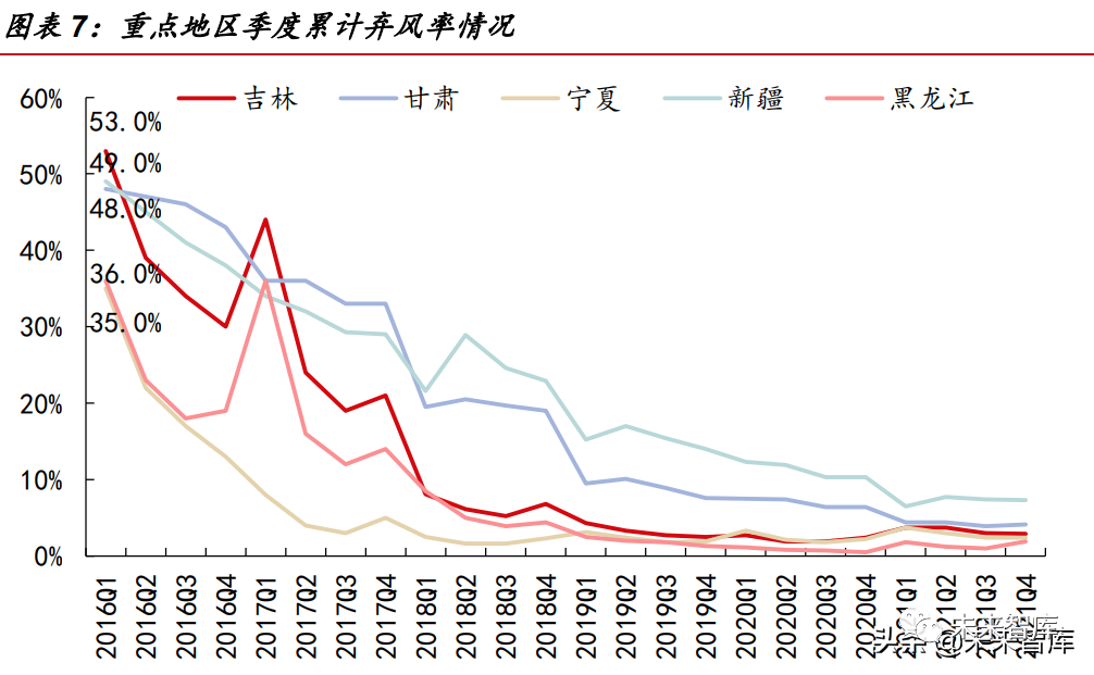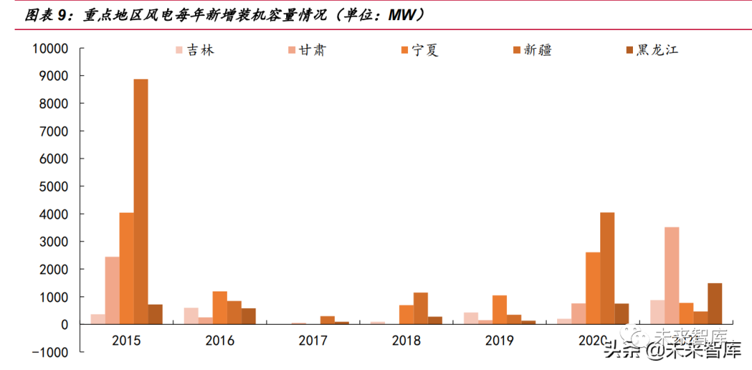 红色地区风电装机断崖式下跌:在预警制度出台后,吉林、宁夏两省区 2017 年 新增风电装机分别从 2016 年的 603、1195MW 断崖式下跌至 0MW,风电投资戛然 而止。其他因弃风率过高而被列入红色、橙色预警的省区如新疆、黑龙江、甘肃,风 电投资也受到强监管政策的影响而大幅下降。风电投资预警监测机制运行的同时,新能源消纳保障政策、特高压通道建设和市 场化交易比例不断提升推动红色、橙色区域呈现逐年减少态势。2018 年宁夏重回绿 色区域,2019 年吉林、黑龙江重回绿色区域,这些省份重回绿色区域的同时释放了 大量的新增项目,2020 年红色区域已完全消失,风电消纳得到了大幅改善。