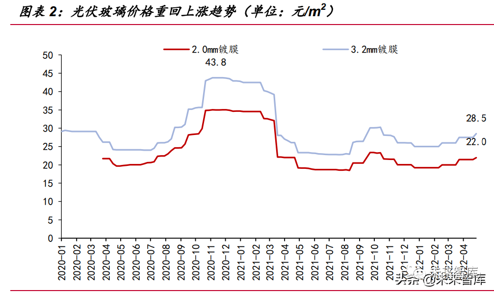 日熔量相同的情况下,薄片化意味着更高的产出。当前主流的 2.0、2.5、3.2mm 厚度的光伏玻璃,呈现越薄其原片良品率越低的状态,但在同为 1000t/d 的日熔量产 能情况下,2.0mm 玻璃能够每年能够匹配 10.27GW 的组件需求,相比 3.2mm 产生 的增益达到了 52.15%。截至 2022 年 3 月底,2.0mm、3.2mm 镀膜玻璃平均报价分 别为 20.0、26.0 元/m2,意味着相同日熔量下,薄片化能够带来 17%的额外收入。