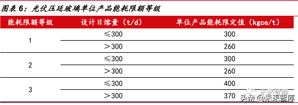 随着双碳政策持续推进,减排、能耗双控要求将持续提升。根据《GB 21340-2019 玻璃和铸石单位产品能源消耗限额》,现有光伏压延玻璃生产企业的光伏压延玻璃单 位产品能耗限定值不应大于能耗限额 3 级,新建或改扩建的项目产品不应大于能耗限 额 2 级。大窑炉技术能够显著降低能耗,凭借着大窑炉技术的成熟应用,以及从能耗 达标、经济性考虑对降能耗存在极大动力。近期新建项目能耗水平均可满足标准要求,听证会公布项目大部分能耗可以达 到国际先进水平,可以满足能耗限额 1 级要求。能耗要求提升推进了大窑炉的应用, 也提升了对光伏玻璃厂商的技术要求,行业正在朝着更高质量、更高技术方向发展。