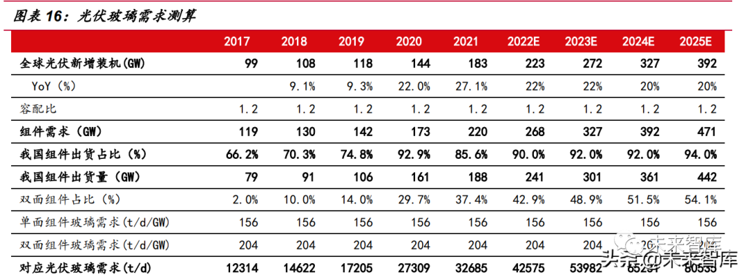 2021-2024 年,光伏玻璃总需求 CAGR 达 25.90%。当前世界范围内电价上涨 有望刺激全球光伏装机量维持 20%以上增速,容配比按照 1.2,单、双面组件分别按 照 156、204(t/d/GW)进行测算得 2022-2024 年我国光伏组件出货对应的光伏玻璃需求量分别达到了 42575、53982、65231t/d。