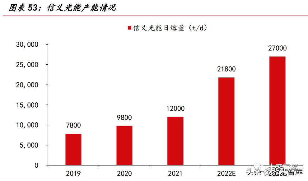 公司 2021 年年初在安徽凤阳 2 条 1200t/d 生产线投产两条全球规模最大的单体 炉窑,处于行业领先地位。当前公司产能共计14600t/d,共有5条1000t/d、6条1200t/d 的大窑炉产线,占自身产能的 84%,处于行业首位。我们预计公司今年还将有 5 条 1200t/d 点火投产,到 2022 年底将拥有 20600t/d 的光伏玻璃产能。(报告来源:未来智库)