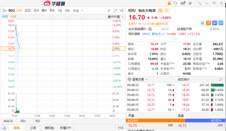 华盛资讯6月13日消息,美股盘初,热门中概股多数下挫,截至发稿,新东方教育逆市涨超3%,报16.7美元。
