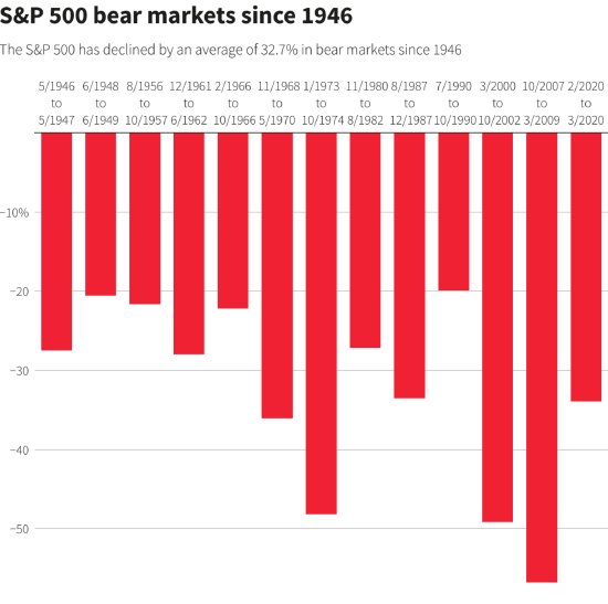 以史为鉴,熊市将意味着投资者可能面临更多痛苦。CFRA首席投资策略师Sam Stovall表示,自1946年以来,标普500指数在13个熊市中的平均跌幅为32.7%,其中在2007-2009年金融危机的熊市期间下跌了近57%。