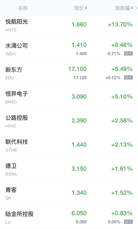 水滴公司涨超8%,新东方涨超5%。