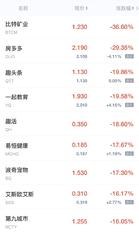 领跌中概股列表: