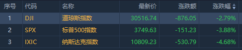 截止收盘,美国三大股指全线收跌,道指跌2.79%报30516.74点,标普500指数跌3.88%报3749.63点,跌入熊市,纳指跌4.68%报10809.23点,创2020年10月以来收盘新低。分析人士表示,人们担心的是,通胀正变得太热,央行将不得不以收紧政策的形式给经济浇一盆冷水。