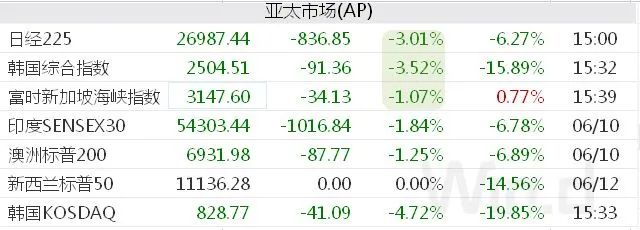 6月13日,亚太市场普跌,韩国综合指数跌3.52%,日经225指数跌3.01%,新西兰NZX50指数跌1.9%。