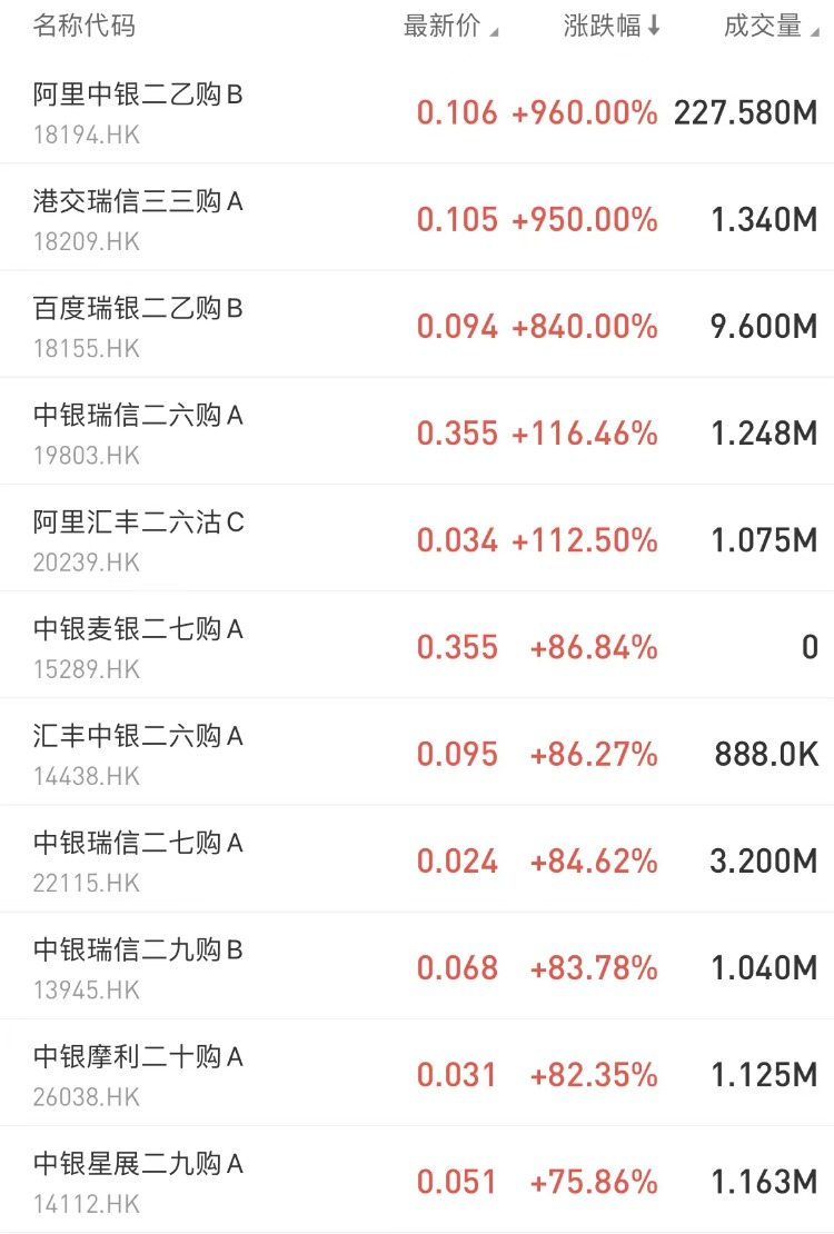 在今日涨幅榜中,居前包括:阿里中银二乙购B $18194.HK 涨960%,港交瑞信三三购A $18209.HK 涨950%,百度瑞银二乙购B $18155.HK 涨840%。