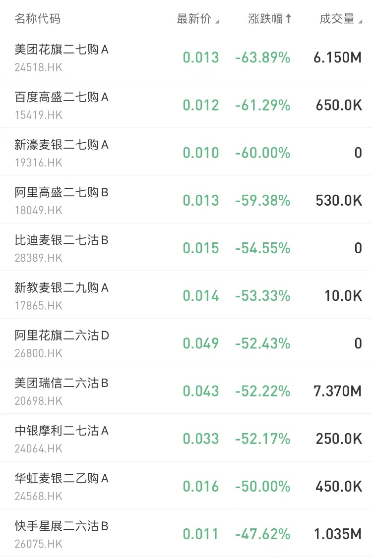 在今日跌幅榜中,美团花旗二七购A $24518.HK 跌63.89%,百度高盛二七购A $15419.HK 跌61.29%。