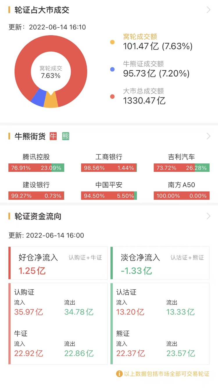 今日所有窝轮牛熊证合计成交197.2亿港元,占大市成交14.83%。