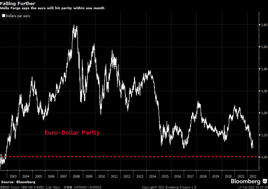 欧元5月中旬跌至五年低点,兑美元年内已下跌8%,因美联储激进的货币政策紧缩导致美国的利率远高于欧洲。富国的预测发布之际,越来越多的人猜测美联储周三可能会将基准利率最高上调75个基点,助推一项美元指数升至逾两年最高位。