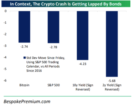 基准10年期美国国债收益率周一最高飙升28个基点,大于4个标准差,这种情况本来应该属于百年一遇的。而2年期国债收益率波动更剧烈,盘中一度飙升35个基点。
