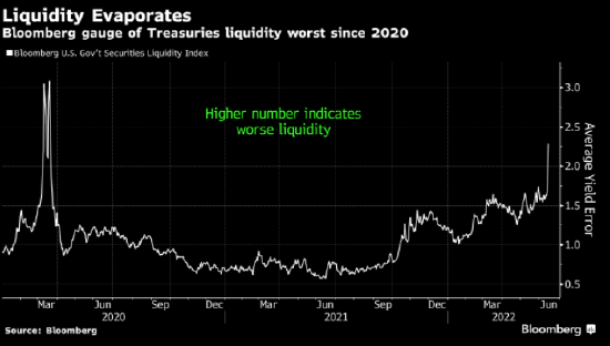 有机构的指数显示,随着交易员们放弃对通胀见顶的希望,债市流动性进一步被削弱,交易条件恶化至疫情爆发之初以来最差,买卖价差飙升。