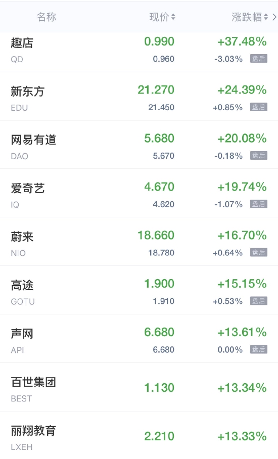 领涨中概股列表:
