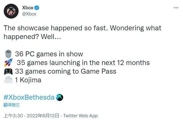 Xbox 的官推用几行字总结了这场发布会:36 款 PC 游戏参展;35 款会在一年内发布;33 款将登陆 Xbox Game Pass;1 款由小岛秀夫操刀的云游戏。
