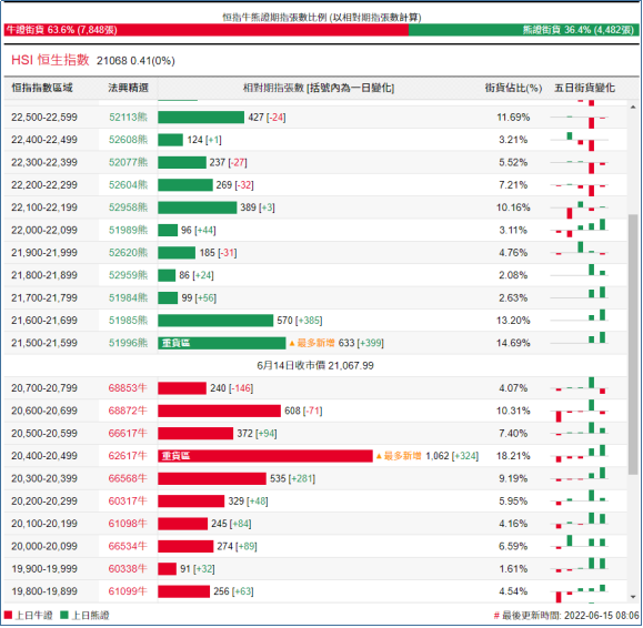 街货分布方面,至周二,恒指牛证街货重货区间主要在收回价20300点至20800点之间,累计相当约2817张期指合约;恒指熊证街货重货区主要在收回价21500点至22000点,累计相当约1573张期指合约。